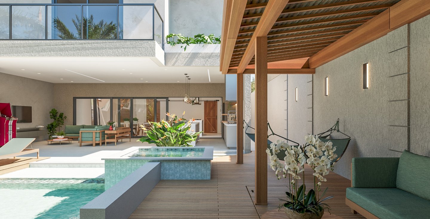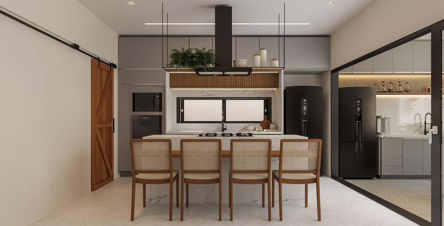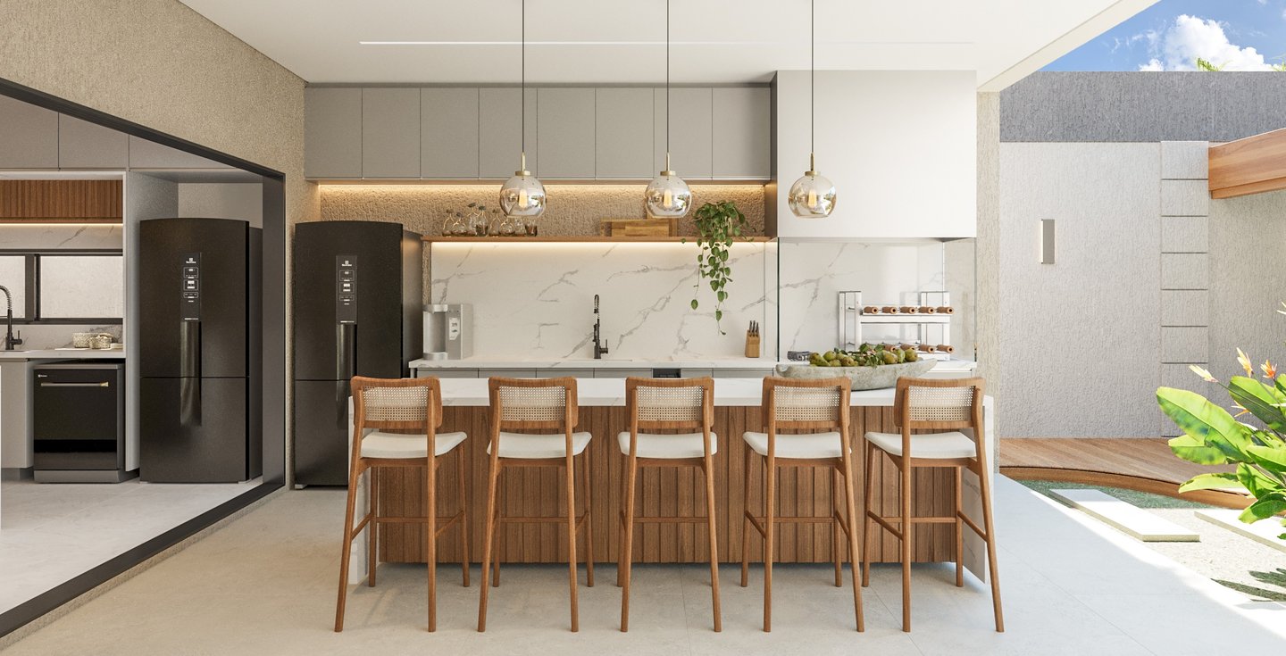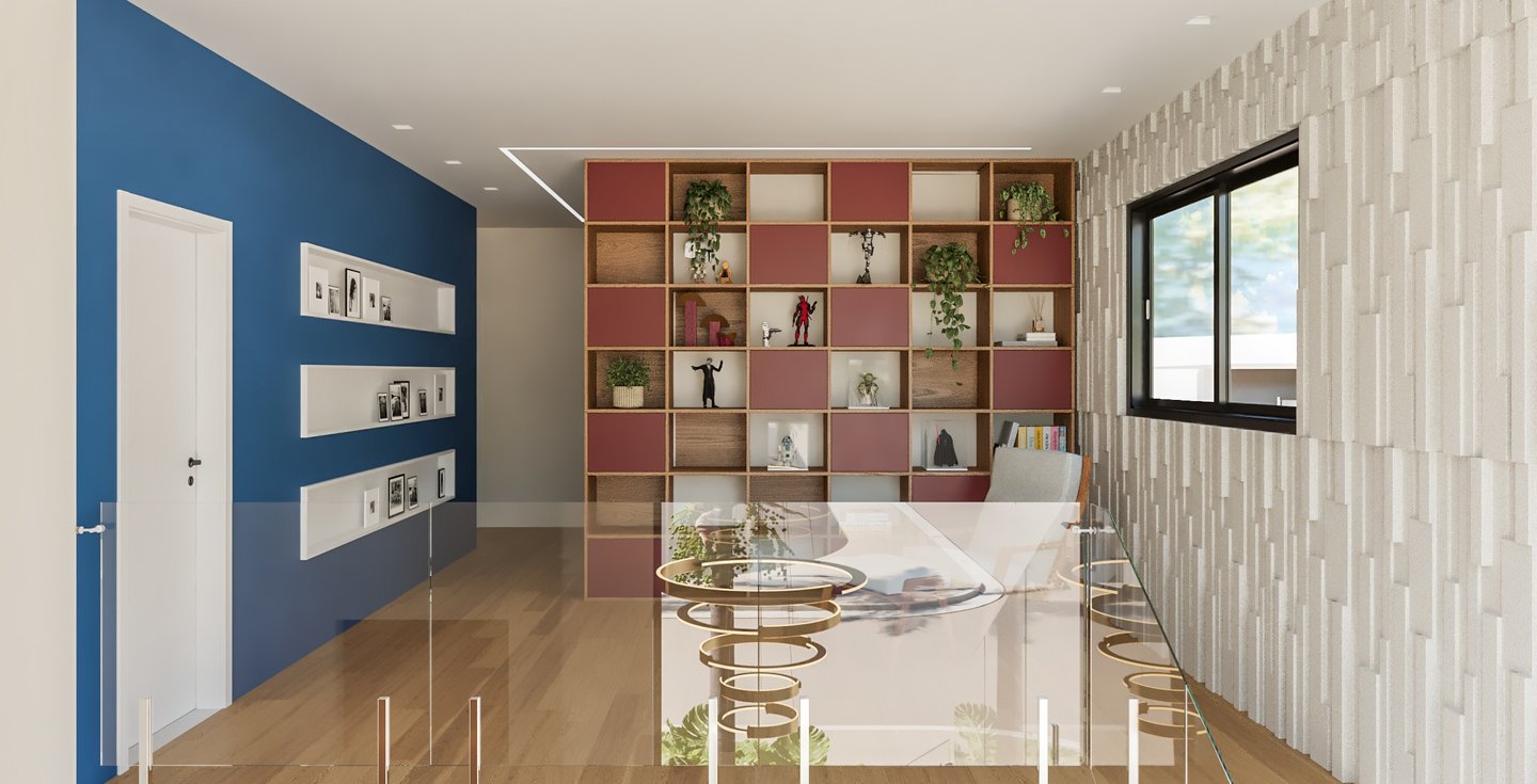 Desejamos uma sala integrada à área gourmet, lavanderia com mobiliário otimizado, despensa ampla, escadaria elegante, espaço de leitura no mezanino e dormitórios cheios de personalidade".