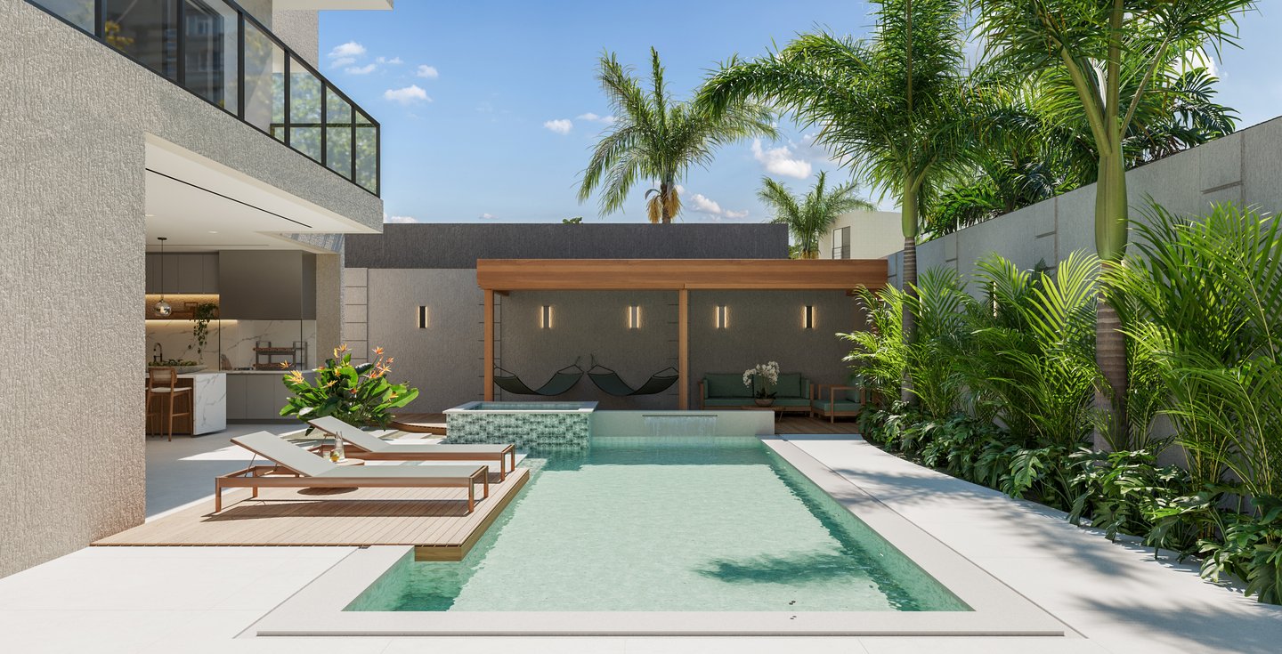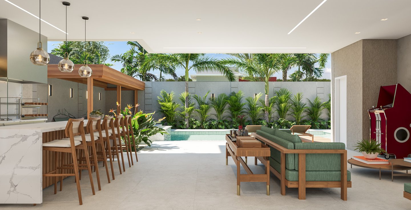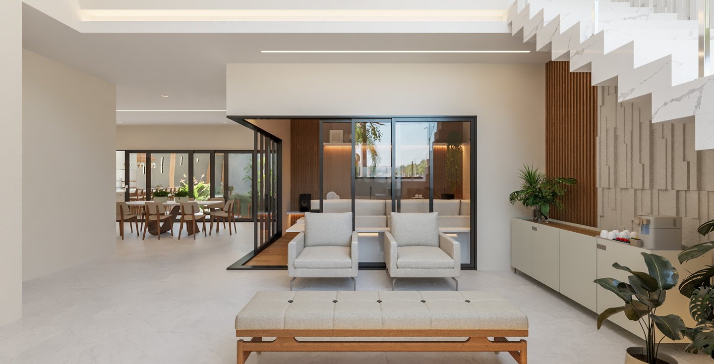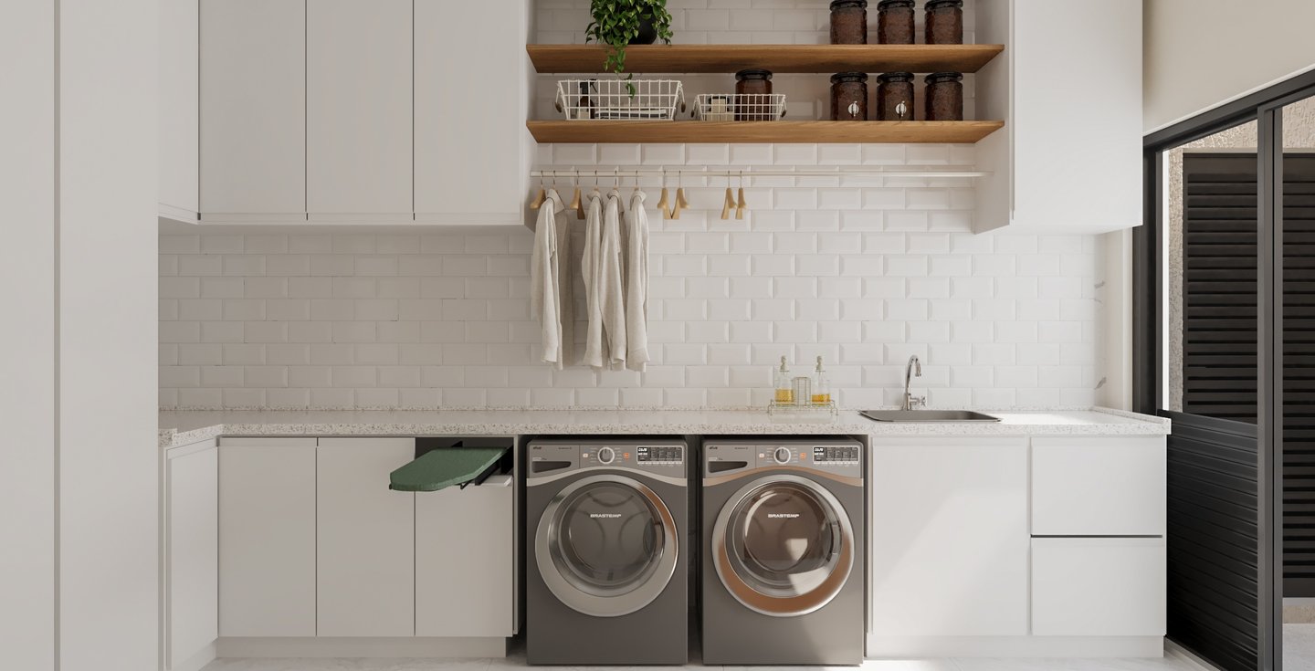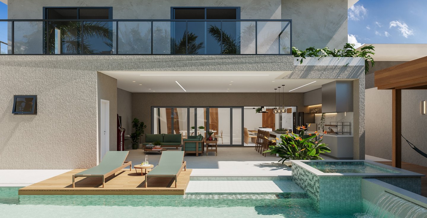 Desejamos uma sala integrada à área gourmet, lavanderia com mobiliário otimizado, despensa ampla, escadaria elegante, espaço de leitura no mezanino e dormitórios cheios de personalidade".