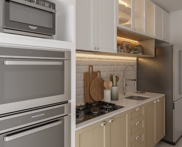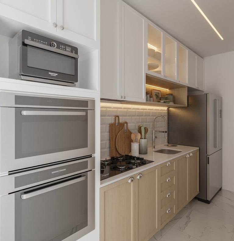 Por ser um garden, desejo aproveitar o terraço, escondendo a lavanderia no ambiente gourmet, para aproveitarmos melhor o espaço da cozinha integrada com a sala".