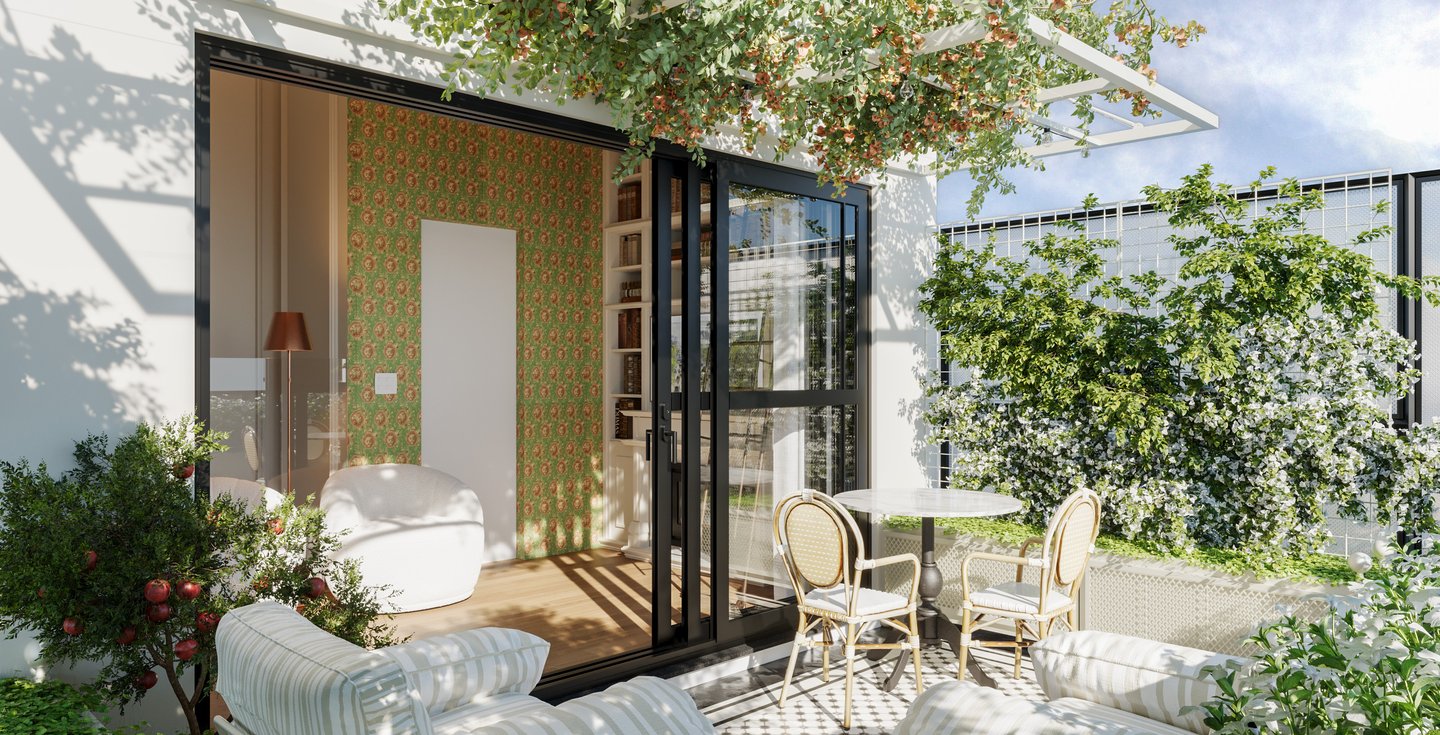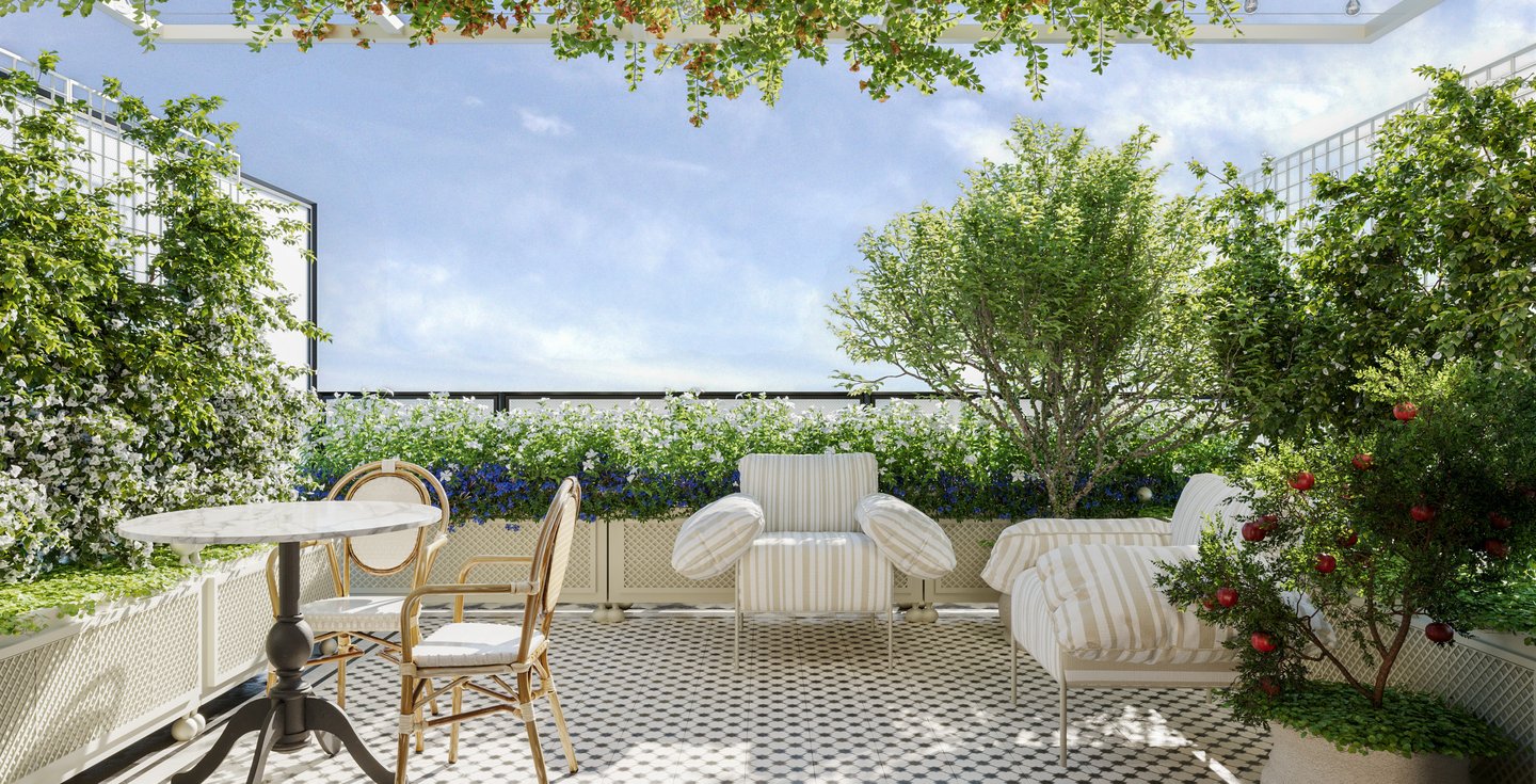 No terraço, um paisagismo com referências aos jardins franceses e um espaço para o café da manhã ao ar livre.”