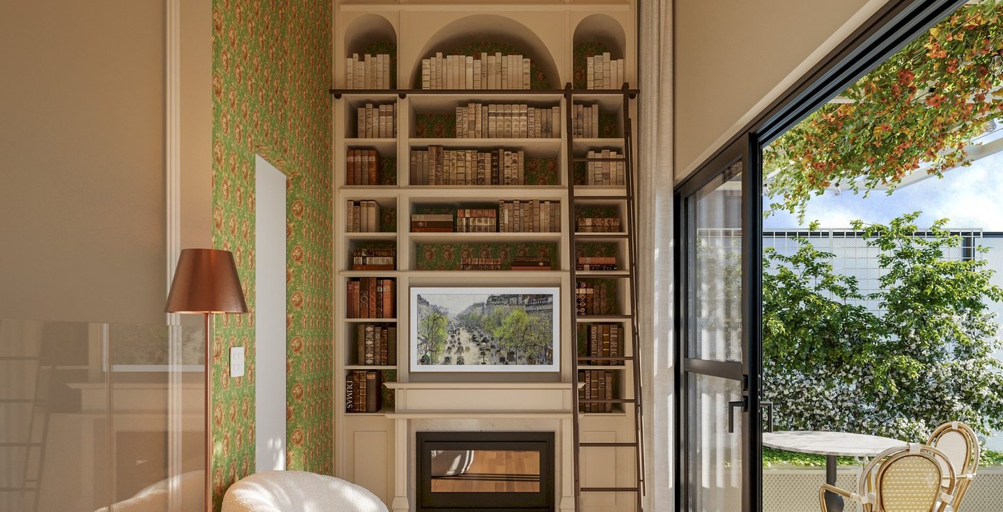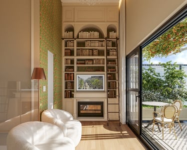 Na área interna da cobertura, desejamos uma biblioteca clássica que acompanhe o pé-direito duplo, integrando lareira e TV, criando um ambiente aconchegante.