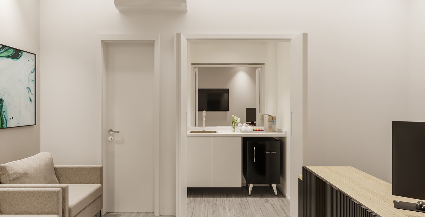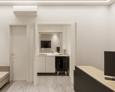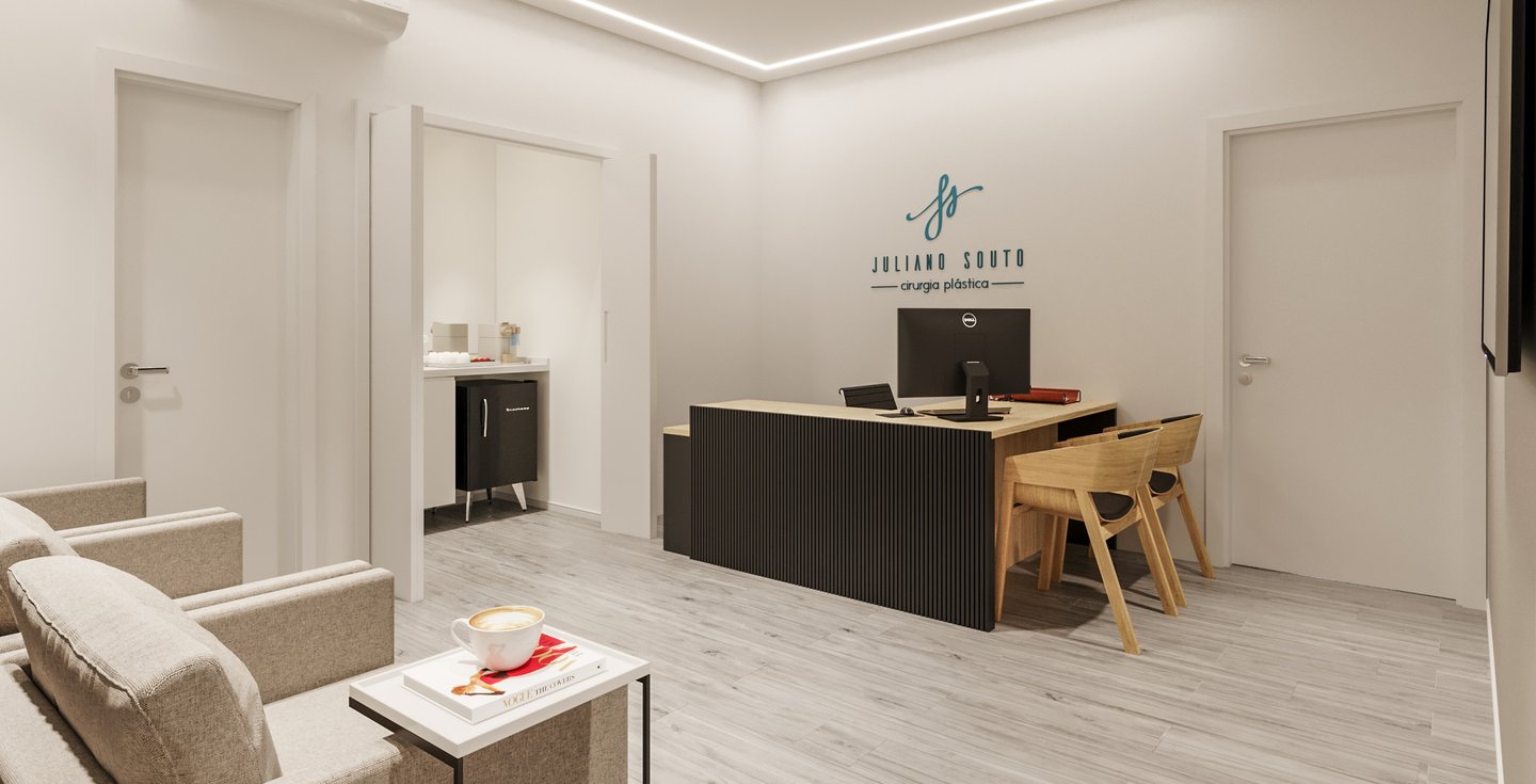Busco uma reforma objetiva com: banheiro privativo na sala de curativos, lavabo na recepção, copa discreta, espaço para café, área para secretária e poltronas confortáveis.
