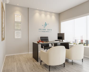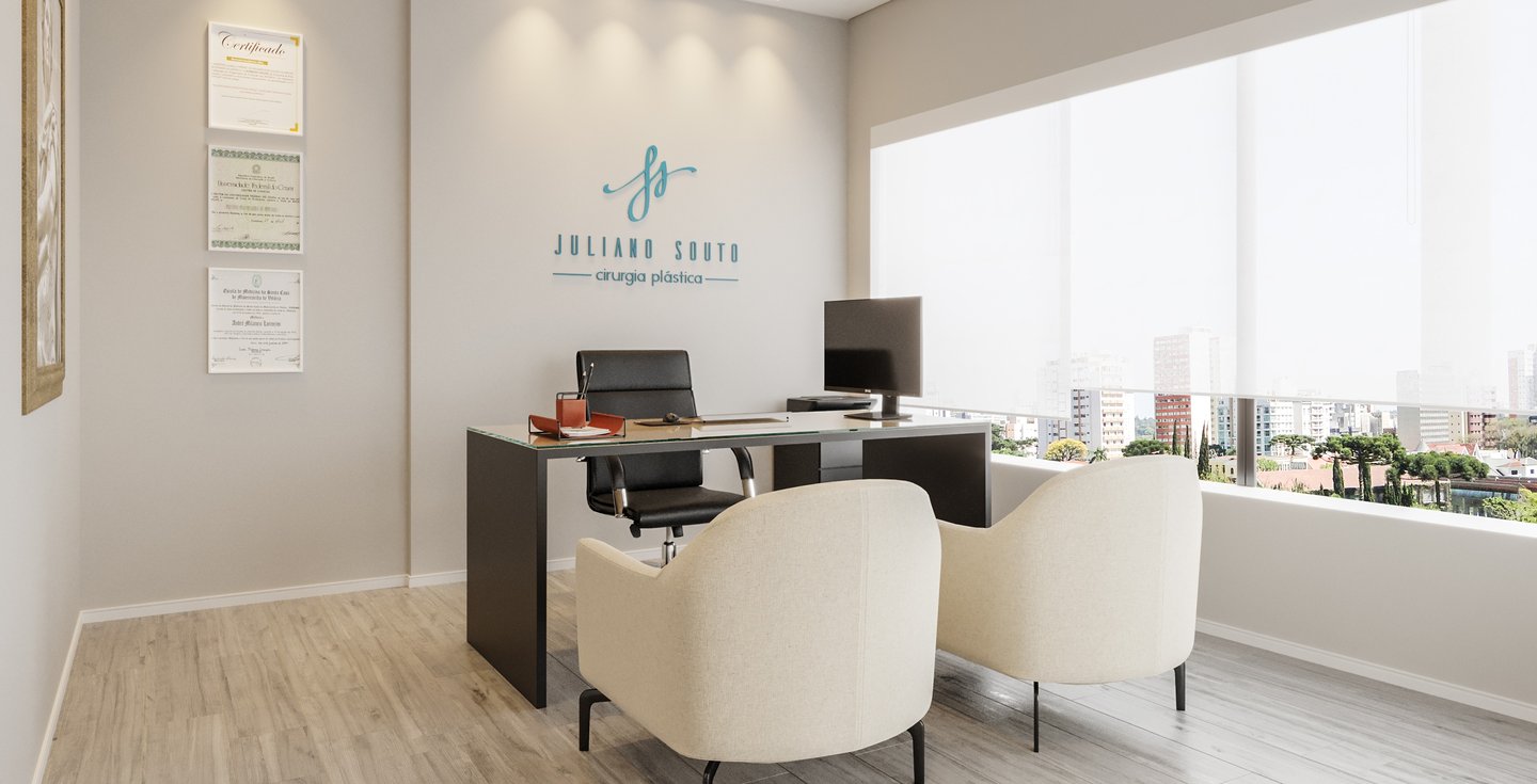 Na sala de consultas, uma mesa ampla e locais para destacar o logo, diplomas e obras de arte".