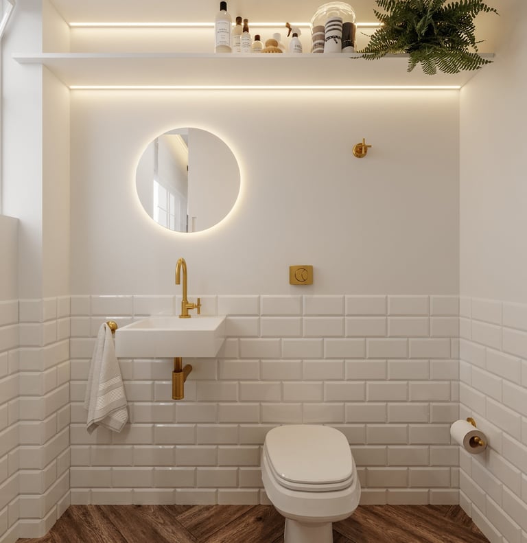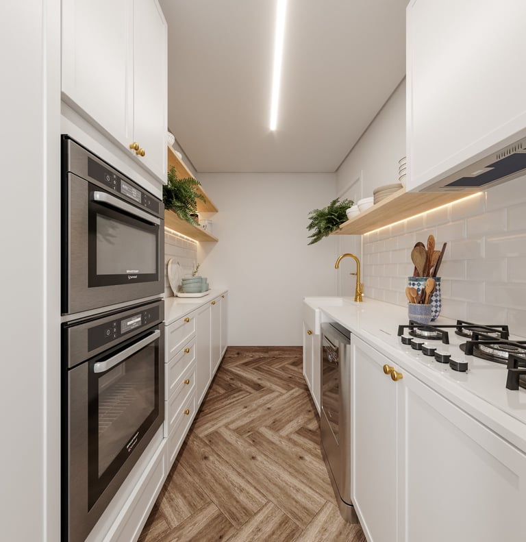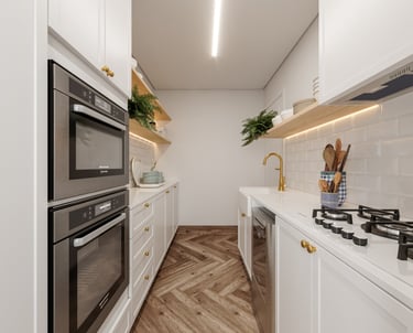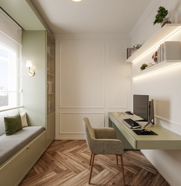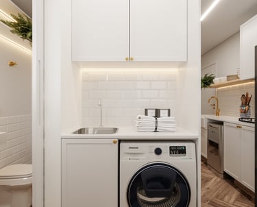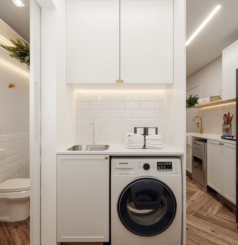 Gostaríamos de uma lavanderia escondida na cozinha, converter o banheiro de serviço em um lavabo e instalar uma lareira falsa na sala, que possa armazenar aparelhos eletrônicos".